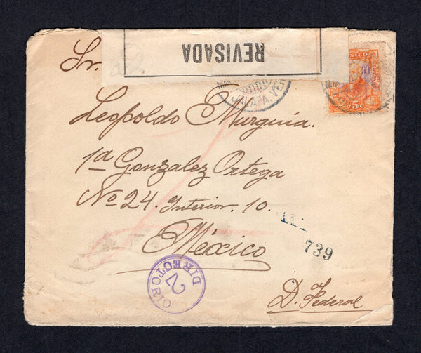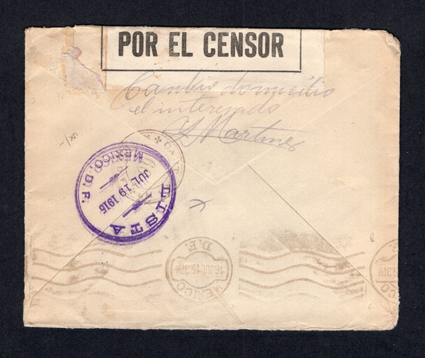 Cover franked with single 1914 5c orange with large 'GCM' Monogram overprint in purple (SG CT26) tied by JALAPA cds dated MAY 1915. Addressed to MEXICO CITY and censored with printed black on white 'REVISADO POR EL CENSOR' censor strip. The cover was unclaimed with various markings inc MEXICO D.F. LISTA cds and manuscript 'Cambio domicilio el intererado' (change of address) notation on reverse.