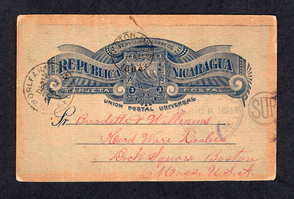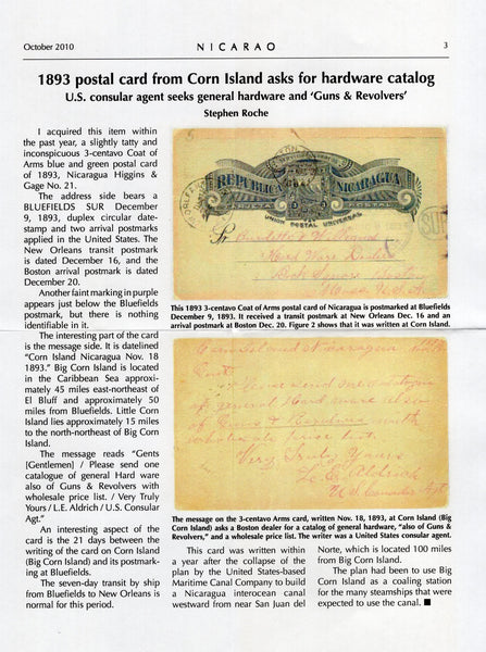 3c blue on buff 'Seebeck' postal stationery card (H&G 21) date lined on reverse 'Corn Island Nicaragua Nov 18 1893' with message written by the US Consular Agent reading 'Gents. Please send one catalogue of general hardware also of guns & revolvers with wholesale price list, very truly yours L. E. Aldrich U.S. Consular Agt.' The card is cancelled with BLUEFIELDS SUR duplex cds dated DIC 9 1893 showing a 21 day transit/sailing time between leaving the island and being put into the mails at Bluefields. The card is addressed to 'Burdette & Williams Hard Ware Dealer, Boston, Mass' with various transit and arrival marks. The card was written a year after the failed attempt to build a Nicaraguan interocean canal where Corn Island was to be used at a coaling station. A very rare item, pictured and described in an article from the October 2010 issue of Nicaro, the Journal of the Nicaraguan Study group, the article accompanies. Some creasing.