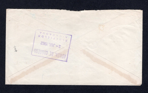 Cover from CORN ISLAND with manuscript 'Ylenda Escalona, North End, Corn Island, Nicaragua' at top left franked with pair 1961 20c on 50c ultramarine 'Revenue' SURCHARGE issue (SG 1411) tied by unclear CORN ISLAND 'Arms' cancel. Addressed to USA with boxed BLUEFIELDS transit mark on front. Rare.
