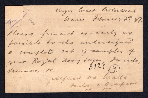 1d vermilion on buff QV postal stationery card of Great Britain with 'NIGER COAST PROTECTORATE' overprint in black (H&G 3) used with two strikes of WARRI squared circle cds in red. Addressed to UK with 'PAID LIVERPOOL BR PACKET cds in red on front. Card has small repair at top right corner, otherwise attractive & scarce.