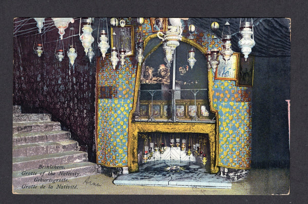 Coloured PPC 'Bethlehem Grotte of the Nativity' franked on message side with single 1918 4m scarlet (SG 8) tied by ARMY POST OFFICE SZ 44 cds dated 7 SEP 1918 located in JERUSALEM with good strike of PALESTINE CENSORSHIP No. 3 cachet in black. Addressed to UK.