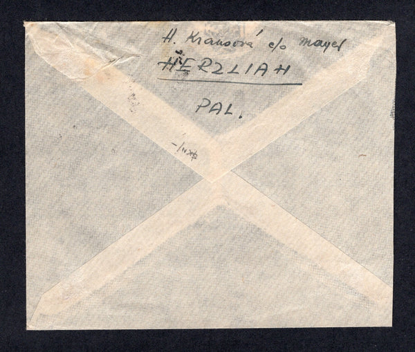 Airmail cover franked with strip of four 1927 10m slate (SG 97) tied by two strikes of HERTSELIYA cds. Addressed to CZECHOSLOVAKIA.