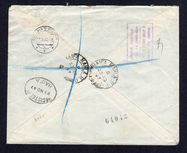 Registered airmail cover franked with 1927 5m orange and 50m bright purple (SG 93 & 100a) tied by HAIFA NAHLA B.O. cds with blue & white printed 'HAIFA 12' registration label alongside. Addressed to CZECHOSLOVAKIA with transit and arrival marks on reverse.
