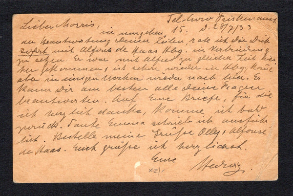 4m deep pink on buff 'Dome of the Rock' postal stationery card (H&G 3) used with added 2 x 1927 2m greenish blue (SG 90) tied by TEL AVIV cds's dated 30 JY 1933. Addressed to GERMANY with full commercial message on reverse.