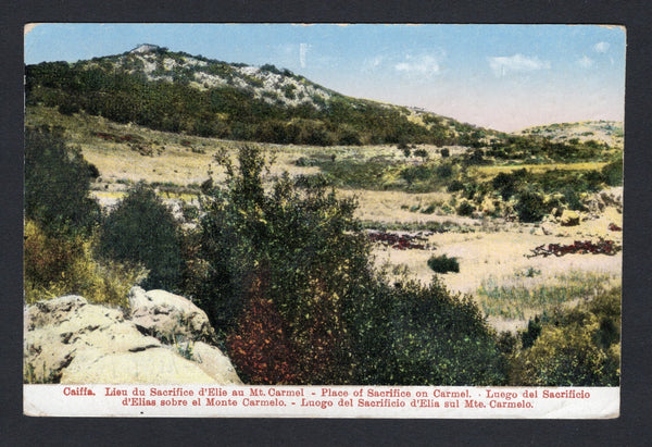 Colour PPC 'Caiffa. Place of Sacrifice on Carmel' franked on message side with 1922 8m scarlet (SG 78) tied by NAZARETH cds dated 13 MAY 1926. Addressed to SWITZERLAND.