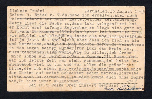 Commercial postcard franked with 1927 2m greenish blue and 1932 strip of three 15m grey blue (SG 90 & 108a) tied by JERUSALEM EXPRESS cds's dated 13 AUG 1945 with straight line 'EXPRESS' handstamp in black alongside. Addressed to HAIFA with MOUNT CARMEL arrival cds dated the next day on reverse.