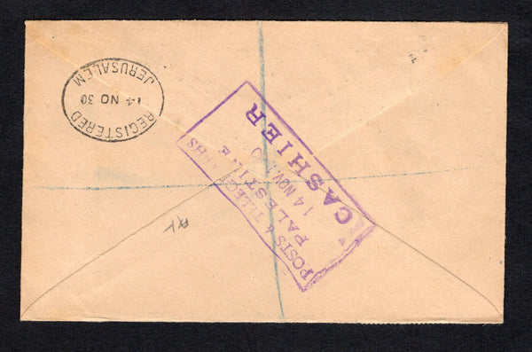 Registered cover franked with 1927 2m greenish blue, 3m yellow green, 4m rose pink, 5m orange, 6m deep green, 7m scarlet, 10m slate and 13m ultramarine (SG 90/95 & 97/98) tied by multiple strikes of oval REGISTERED JERUSALEM cancels dated 14 NOV 1930 with printed blue on white 'JERUSALEM' formular registration label alongside. Addressed to UK with large boxed 'POSTS & TELEGRAPHS PALESTINE CASHIER' cachet in purple on reverse.