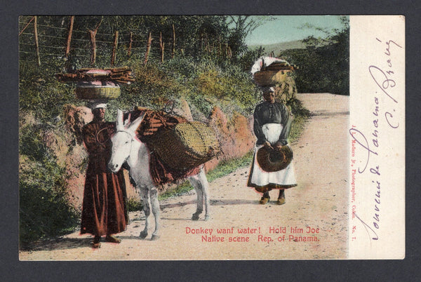 Colour PPC 'Donkey want water! Hold him Joe, Native Scene. Rep. of Panama' franked on message side with single 1904 10c orange MAP issue with 'Fourth Panama' overprint (SG 56) tied by fine strike of octagonal COLON A BORDEAUX L. D. No.2 French maritime cds dated 15 AUG 1906. Addressed to FRANCE.