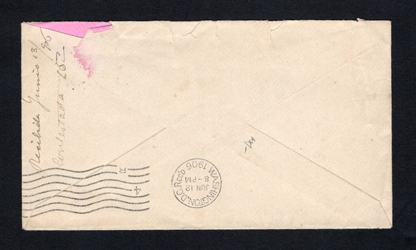 Cover with manuscript 'Per. S S. Colon' in bottom corner franked with 1906 2c on 1p lake MAP issue with 'CANAL ZONE' surcharge Type 2 (SG 23) tied by two line PAQUEBOT (N.Y. 2D DIV) cancel in black. Addressed to USA with WASHINGTON DC arrival cds dated JUN 12 1906 on reverse. Cover a little roughly opened at top but a scarce issue used on cover.