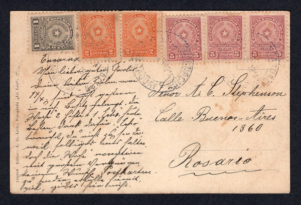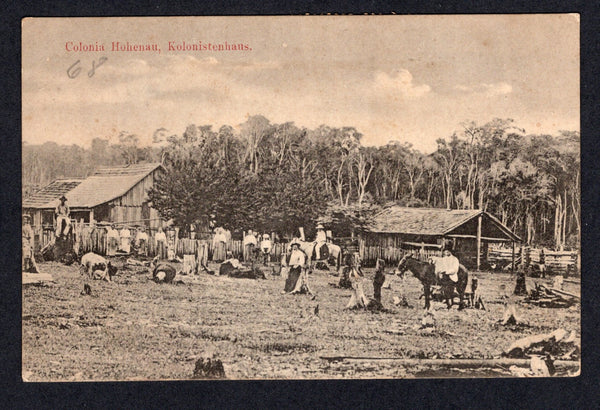Black & white PPC 'Colonia Hohenau, Kolonistenhaus' (Colonia Hohenau broke away from Colonia Nueva Germania in 1900 to establish a separate colony with different ideals) franked on message side with 1913 1c black, pair 2c orange & strip of three 5c dull mauve (SG 226/228) tied by VILLA ENCARNACION cds's. Addressed to ARGENTINA.