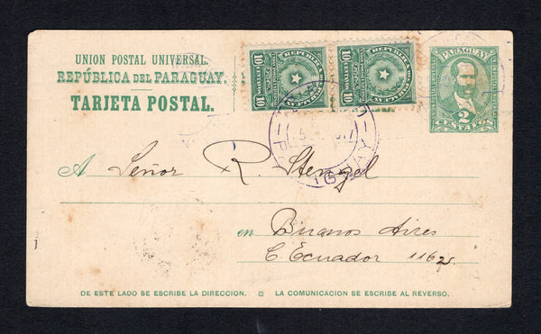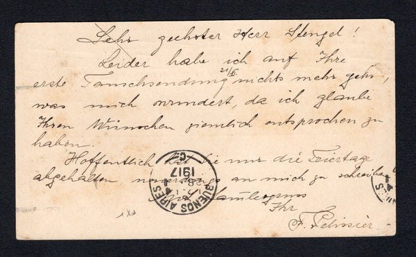 2c green postal stationery card (H&G 9) used with added 1913 pair 10c green 'Arms' issue (SG 229) tied by TRINIDAD cds in purple dated 5 JAN 1917. Addressed to ARGENTINA with BUENOS AIRES arrival cds on reverse.
