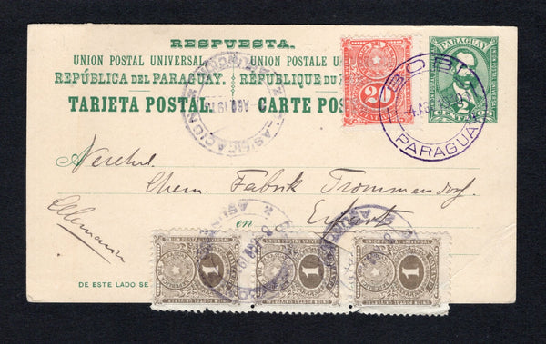 2c + 2c green postal stationery replycard (H&G 11 reply half only) used with added 1910 strip of three 1c bistre brown and 20c red 'Arms' issue (SG 207 & 214) tied by fine BOBI cds dated 4 AGO 1910. Addressed to GERMANY with ASUNCION transit cds's on front tying the strip of three 1c. A scarce cancel & origination.