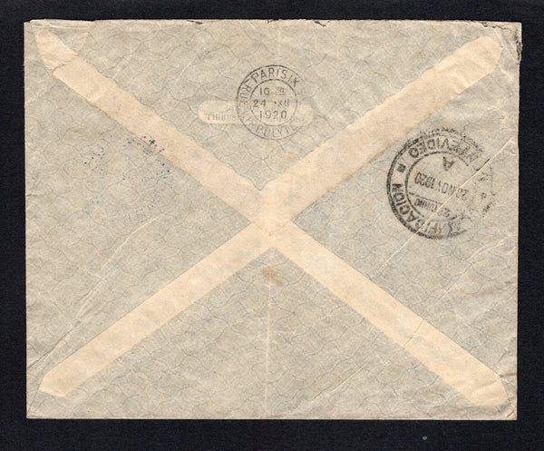 Cover franked with strip of four 1920 '50' on 75c deep blue 'Arms' SURCHARGE issue (SG 251) tied by two strikes of CIUDAD PILAR cds in bluish purple dated 24 NOV 1920. Addressed to FRANCE with MONTEVIDEO, URUGUAY transit cds and French arrival cds on reverse. A very scarce short-lived issue used on cover.