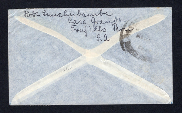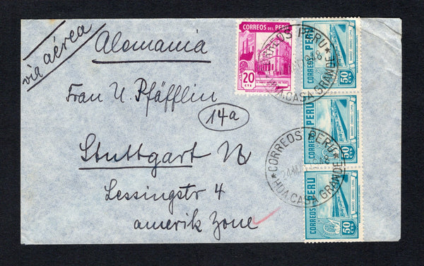 Airmail cover franked with 1938 20c bright purple and strip of three 50c greenish blue (SG 644/645) tied by two fine strikes of large CORREOS PERU HDA. CASA GRANDE cds dated 24 May 1948. Addressed to GERMANY with transit marks on reverse.
