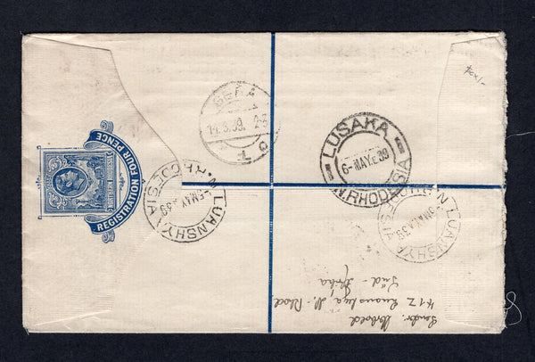 4d dull blue GVI postal stationery registered envelope (H&G C2) used with added 1938 1d brown, 4d dull violet and a top marginal 2/6 black and green with '223' sheet number handstamp in top margin (SG 27, 36 & 41) all tied by LUANSHYA cds's dated 5 MAY 1939 with printed blue on white 'LUANSHYA' registration label and blue airmail label alongside. Addressed to GERMANY with transit & arrival marks on reverse. The 2/6 is very scarce used on cover.
