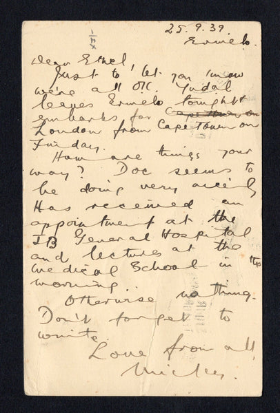 ½d green postal stationery card (H&G 18) used with added 1933 block of six and single 1d grey & carmine 'Ship' issue (SG 56) tied by ERMELO cds's dated 25 IX. 1939. Sent airmail to JERUSALEM, PALESTINE with hexagonal 'PALESTINE PASSED BY CENSOR H.1' censor mark in purple on front. A very unusual destination.