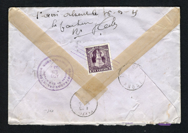 Heavyweight registered cover franked with 1924 2 x 1c brown purple (one on reverse), 1934 2c chocolate brown and 2 x 8c ultramarine and 1935 2 x 15c ochre with 'HABILITADO' overprint (SG 750, 820, 822 & 839) all tied by 'Lines' cancels with boxed REGISTRADOS ALEGRIA cancel alongside in purple. Addressed to FRANCE with transit & arrival marks on reverse.