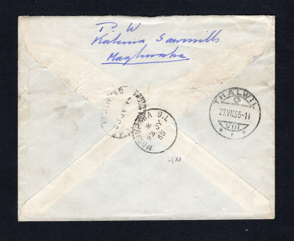 Registered cover franked with 1938 1d black & lake, 3d black & ultramarine and 1/3 yellow orange GVI issue (SG 189, 192 & 196a) tied by three fine strikes of MAGBURAKA cds dated 22 JY 1955 with printed blue on white 'MAGBURAKA' formular registration label alongside. Sent airmail to SWITZERLAND with transit & arrival marks on reverse.
