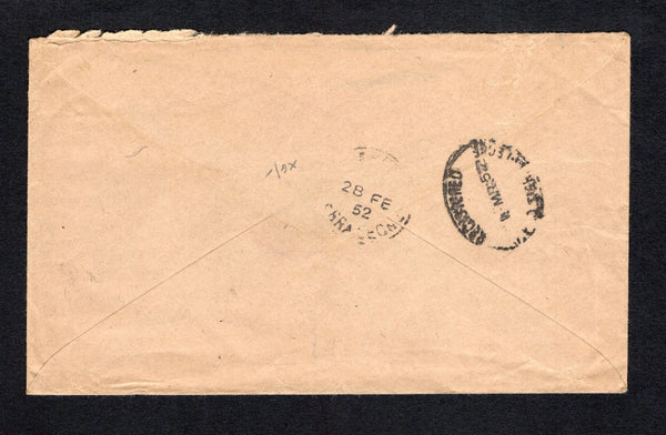 Cover franked with strip of three and single 1938 1½d mauve GVI issue (SG 190a) tied by KABALLA cds's dated 8 FE 1952 with boxed 'KABALLA' registration handstamp on front. Addressed to UK with transit & arrival marks on reverse.