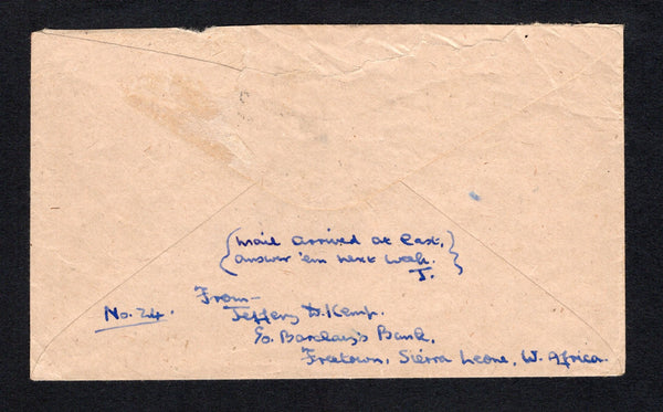 Cover franked with 1938 3d black & ultramarine and 1/- black & olive green GVI issue (SG 192 & 196) tied by FREETOWN cds dated 6 JA 1943 with fine strike of octagonal Crown 'PASSED QQ/1' censor mark in purple on front. Sent airmail to UK with nice blue on light blue airmail label at top.