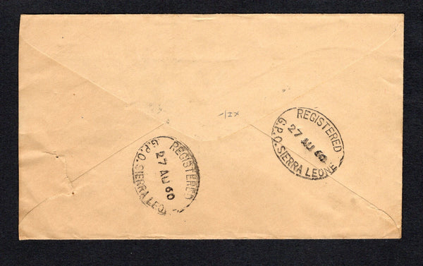 Registered cover franked with 1956 3d black & bright blue, 6d black & violet and 1/- black & scarlet QE2 issue (SG 214 & 216/217) tied by oval REGISTERED G.P.O. SIERRA LEONE cancels dated 27 AU 1960 with printed blue on white formular registration label with 'MARENI' added in manuscript alongside. Sent airmail to UK with transit marks on reverse.