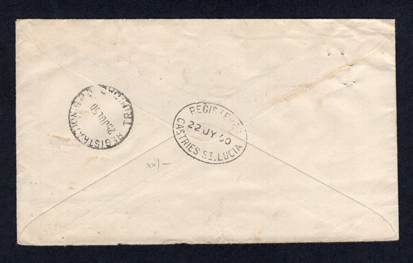 Registered cover franked with 1949 16c brown and 24c light blue GVI issue (SG 154 & 155) tied by oval REGISTERED CASTRIES cancel with printed blue & white 'ST. LUCIA (CASTRIES)' registration label alongside. Sent airmail to UK with TRINIDAD transit cds on reverse.