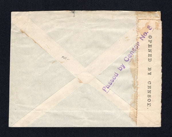Cover franked with 1938 3d orange & deep reddish purple GVI issue (SG 154) tied by KINGSTOWN cds dated 21 AU 1940 and censored with printed 'OPENED BY CENSOR' perforated black on white censor strip at left tied by fine strike of straight line 'Passed by Censor No.8' marking in purple on reverse. Addressed to USA. A scarcer censor.