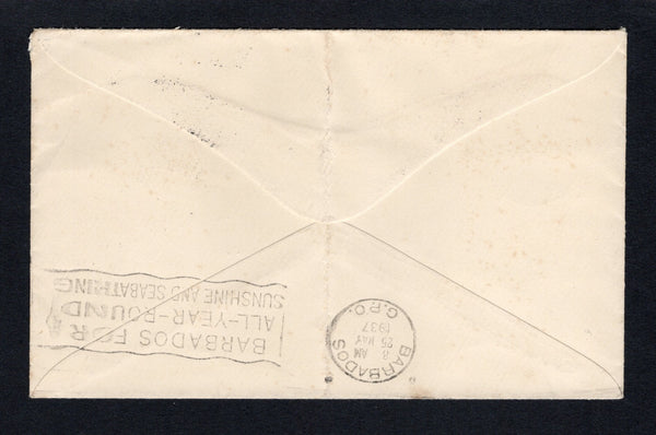 Cover franked with 1937 2 x 1d violet, pair 1½d carmine and 2 x 2½d blue GVI 'Coronation' issue (SG 146/148) tied by multiple strikes of EDINBORO cds dated 12 MY 1937 (the first day of issue). Addressed to 'I.G. Proverbs Esqr. Knight's Ltd, P.O.Box 195, Barbados. B.W.I.' with BARBADOS GPO arrival mark on reverse.
