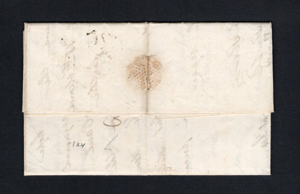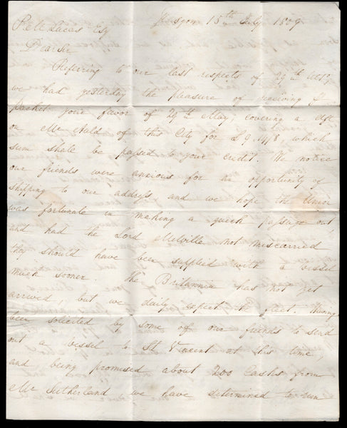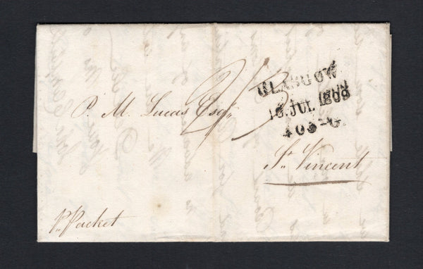 Complete incoming folded letter datelined 'Glasgow 15th July 1809' with three line GLASGOW 16 JUL 1809 405-G mileage marking in black on front with 'P.Packet' and rated '2/3' in manuscript. Addressed to 'P.M. Lucas Esq. St Vincent'. The letter mentions that the sugar market has improved and that the demand for rum continues but the price has not risen. The letter also includes details of shipping with the Lord Melville miscarrying goods and the Britannica having not yet arrived. A nice early incoming item.