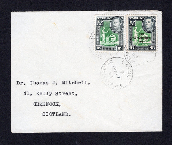 Cover franked with 1949 1c green & black and 1951 4c green & black GVI issue (SG 164a & 185) tied by LAYOU cds's dated JU 1 1953. Addressed to UK.
