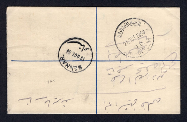 4½p chestnut on cream 'Camel' postal stationery registered envelope (H&G C14) used with added 1951 10m black & pale blue (SG 128) tied by SENNAR cds dated 11 OCT 1959 with printed blue & white 'SENNAR' registration label on alongside. Addressed to KHARTOUM with arrival cds on reverse.