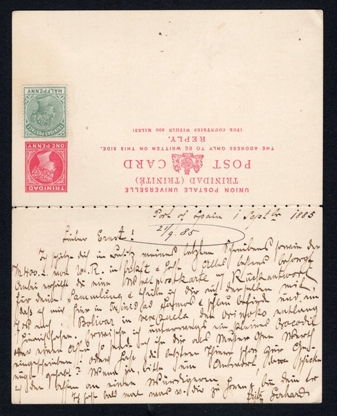 1d + 1d carmine on cream QV postal stationery reply card (H&G 6, both halves intact) used with added 1883 ½d dull green QV issue (SG 106) tied by TRINIDAD cds's dated SP 4 1885 and with uncancelled ½d dull green attached to reply half which is unused. Addressed to GERMANY with arrival cds on front. Long commercial message on reverse.