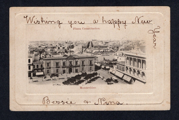 Black & white PPC 'Plaza Constitucion Montevideo' franked on message side with 1900 2c vermilion (SG 231, some toned perfs) tied by barred numeral 'F 57' with fine strike of ESTAFETA AMBUTE 'G 20' cds alongside dated 1 JAN 1902. Addressed to MONTEVIDEO with boxed CARTEROS arrival mark on front.