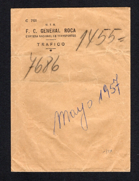 Official printed 'M. T. N. F. C. General Roca. Empresa Nacional de Transportes' TRAFICO envelope with illustrated TRAIN & Signal advert on reverse in red inscribed in Spanish 'Red Light Ahead. Danger Ahead. The driver is ensuring the safety of passengers and the railway personnel. Ensure the safety of the driver and his family.' used with manuscript notations on front.