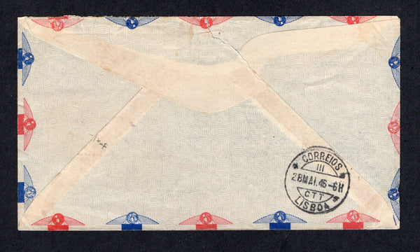Airmail cover franked with 1940 20c bistre brown and pair 50c blue (SG 630 & 635) tied by CARACAS cds dated MAY 22 1946. Flown on the Venezuela - Europe first flight by Línea Aeropostal Venezolana with fine strike of four line 'PRIMER VUELO VENEZUELA - EUROPA VIA LISBOA, PORTUGAL POR L.A.V. Addressed to UK with LISBON arrival cds on reverse. (Unlisted in Muller)