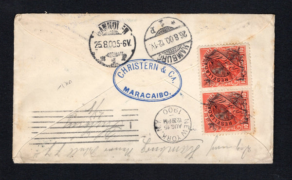 Cover franked with pair & single 1900 10c vermilion 'Bolivar' issue with 'RESELLADA R.T.M.' overprint issue (SG 200) plus an uncancelled pair on reverse with undated MARACAIBO cancels in blue tying the stamps on the front of the cover. Addressed to GERMANY with USA transit and German arrival marks on reverse. Cover has a few light tones.