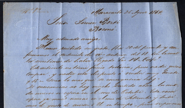 Complete folded letter from MARACAIBO, datelined 'Maracaibo 25 Agosto 1864' inside franked with 1863 1r blue 'Eagle' issue (SG 19) cancelled by '0' rate marking in black. Addressed to BOCONO. Cover shows a little wear on front from two filing creases but otherwise fine looking.