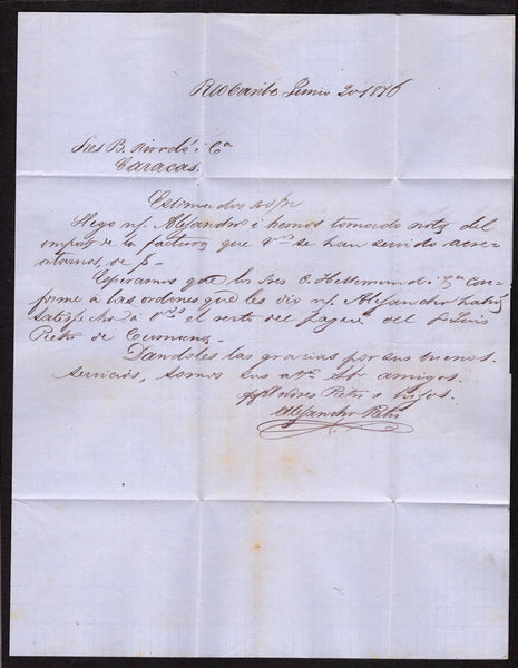 Complete folded letter datelined 'Andres Pietri, Riocaribe Junio 20 1876' forwarded by hand with good strike of 'MSR STOCKMEYER COMISIONISTA LA GUAIRA' forwarding agents handstamp in purple on front then franked with four margin 1873 ½r rose pink with 'Contrasena - Estampillas de Correos' overprint in large letters (SG 79, third Aramburu printing) tied by undated CORREOS LA GUAIRA cds in black. Addressed to CARACAS. A few light tones but an interesting cover.