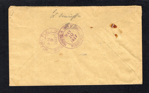 Registered cover with typed 'CORREO AEREO' at top franked with single 1932 2b 30c scarlet AIRMAIL issue on Security Banknote paper (SG 441) tied by CARACAS cds dated 5 MAY 1937 with printed red on white 'Caracas' registration label alongside. Addressed to USA with transit & arrival marks on reverse.